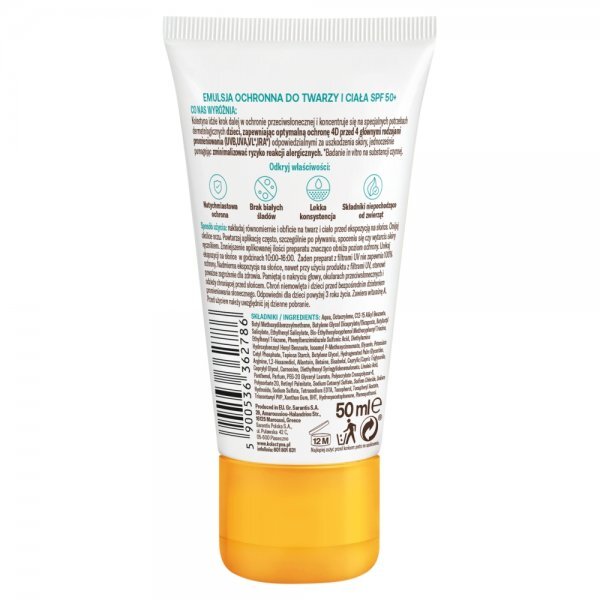 Sposób użycia: nakładaj równomiernie i obficie na twarz i ciało przed ekspozycją na słońce. Omijaj okolice oczu. Powtarzaj aplikację często, szczególnie po pływaniu, spoceniu się czy wytarciu skóry ręcznikiem. Zmniejszenie aplikowanej ilości preparatu znacząco obniża poziom ochrony. Unikaj ekspozycji na słońce w godzinach 10:00-16:00. Żaden preparat z filtrami UV nie zapewnia 100 % ochrony. Nadmierna ekspozycja na słońce, nawet przy użyciu produktu z filtrami UV, stanowi poważne zagrożenie dla zdrowia. Pamiętaj o nakryciu głowy, okularach przeciwsłonecznych i odzieży chroniącej przed słońcem. Chroń niemowlęta i dzieci przed bezpośrednim działaniem promieniowania słonecznego. Odpowiedni dla dzieci powyżej 3 roku życia. Zawiera witaminę A. Przy stosowaniu należy uwzględnić jej dzienne pobranie.