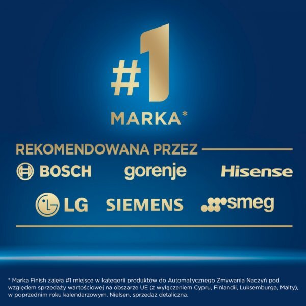 Marka Finish zajęła #1 miejsce w kategorii produktów do Automatycznego Zmywania Naczyń pod względem sprzedaży wartościowej na obszarze UE (z wyłączeniem Cypru, Finlandii, Luksemburga, Malty), w poprzednim roku kalendarzowym. Nielsen, sprzedaż detaliczna.