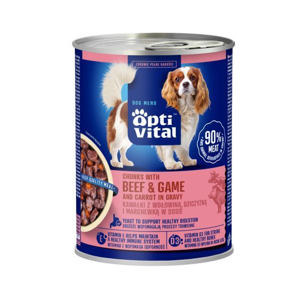 Skład: mięso i produkty pochodzenia zwierzęcego (90% w kawałkach* w tym 8% wołowina, 8% dziczyzna), warzywa (4% marchewka), produkty pochodzenia roślinnego, roślinne ekstrakty białkowe, substancje mineralne.*Kawałki zazwyczaj stanowią 54% produktu. Składniki analityczne: wilgotność 81%, białko surowe 8%, tłuszcz surowy 4,5%, popiół surowy 2,5%, włókno surowe 0,4%.