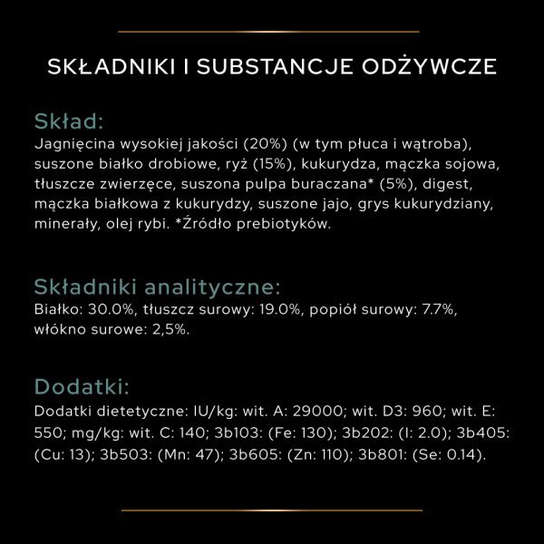 Sucha karma dla psów Purina PRO PLAN Sensitive Digestion zawiera wysokiej jakości kawałki jagnięciny jako pierwszy składnik oraz inne lekkostrawne składniki wspomagające proces trawienia. Zawiera również prebiotyki, które jak udowodniono naukowo, zwiększają zawartość bifidobakterii dla lepszej równowagi mikrobiomu jelit. Dzięki wysokiej zawartości białka karma pomaga utrzymać silne mięśnie, idealną kondycję ciała oraz wspiera prawidłowy rozwój psa.