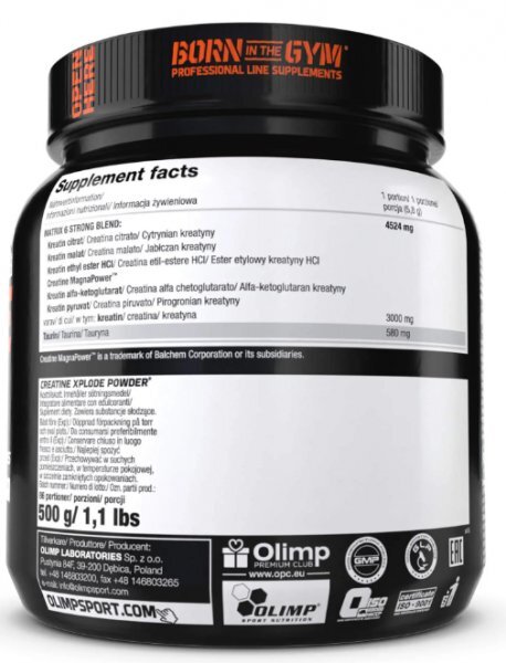 Olimp Creatine Xplode Powder® to suplement diety marki Olimp Sport Nutrition przeznaczony dla osób dorosłych, aktywnych fizycznie i sportowców, wykonujących ćwiczenia fizyczne o dużej intensywności.