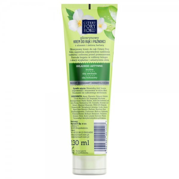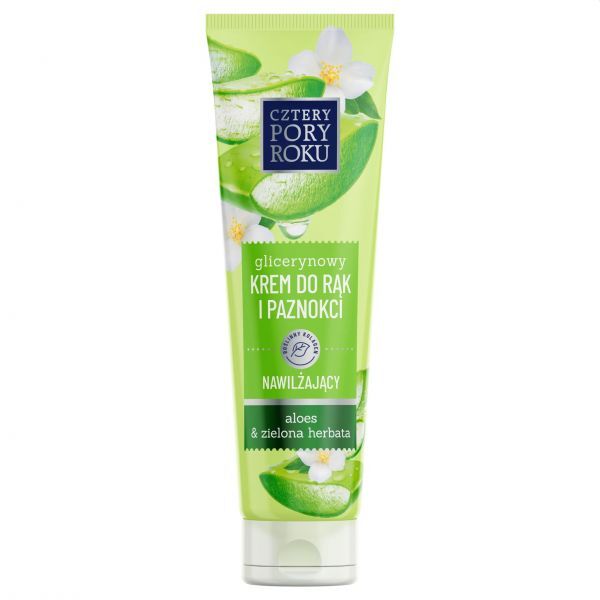 Sucha i wrażliwa skóra dłoni wymaga intensywnego nawilżenia i ochrony, dlatego glicerynowy krem do rąk Cztery Pory Roku został wzbogacony o aloes i ekstrakt z zielonej herbaty, które silnie nawilżają, łagodzą podrażnienia oraz pielęgnują płytkę paznokcia. Małe, poręczne opakowanie zmieści się do damskiej torebki, a także idealnie sprawdzi się w podróży.
