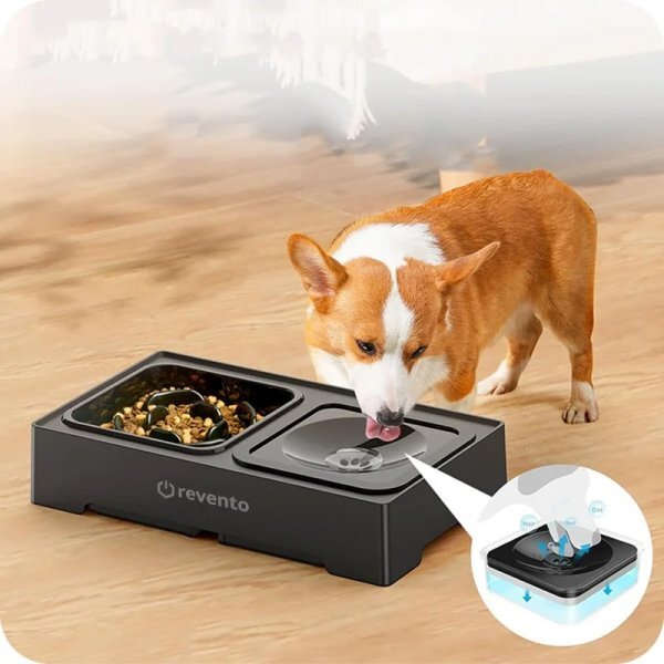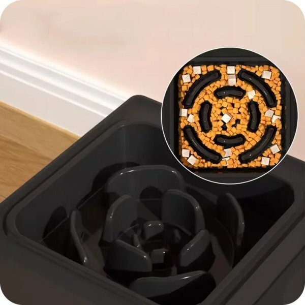 - Miska spowalniająca jedzenie i picie – Specjalne przegrody w misce na karmę spowalniają jedzenie, a pływająca przegroda w misce na wodę reguluje picie, zapobiegając wzdęciom i zachłyśnięciu.