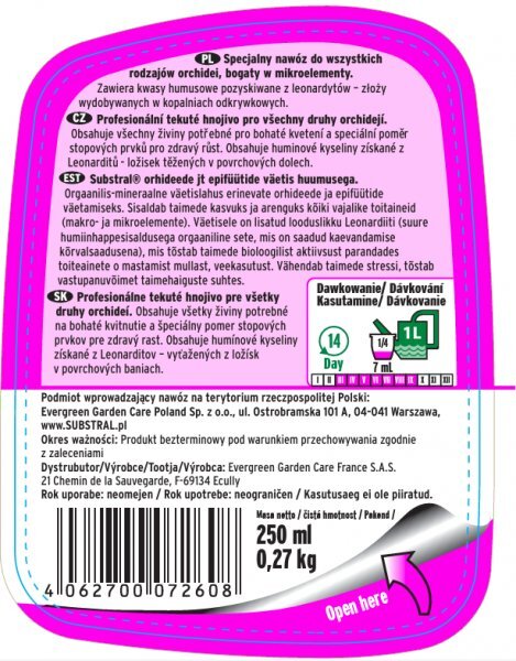 Specjalistyczny nawóz mineralny przeznaczony do wszystkich orchidei. Zawiera unikalną mieszaninę składników odżywczych w postaci humusu, które gwarantują optymalny wzrost. Specjalna formuła pozwala na całkowitą i szybką absorpcję nawozu, tak aby utrzymać rośliny w pełnym zdrowiu, by były silniejsze i lepiej kwitły. Nawóz ma postać koncentratu, którym należy podlać rośliny po uprzednim rozcieńczeniu. W wygodny i prosty sposób pozwala to łączyć podlewanie z nawożeniem. Dobra stabilizacja płynu zapobiega wytrącaniu się kryształków nawozu na ściankach butelki.