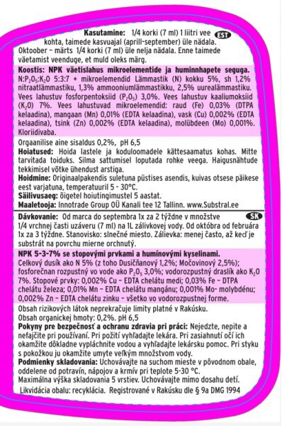 Roztwór nawozowy NPK 5-3-7% (m/m) z mieszaniną mikroskładników pokarmowych oraz kwasów humusowych. Azot (N) całkowity 5%, w tym azotanowy 1,2%, amonowy 1,3%, amidowy 2,5. Pięciotlenek fosforu (P2O5) 3,0% rozp. w wodzie. Tlenek potasu (K2O) 7% rozp. w wodzie. Miedź (Cu) 0,002% (schel. EDTA) rozp. w wodzie, żelazo (Fe) 0,03% (schel. DTPA) rozp. w wodzie, mangan (Mn) 0,01% (schel. EDTA) rozp. w wodzie, molibden (Mo) 0,001% rozp. w wodzie, cynk (Zn) 0,002% (schel. EDTA) rozp. w wodzie).