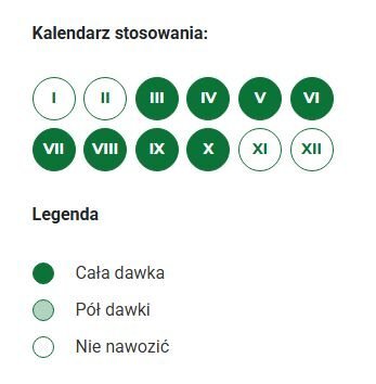 Trawniki: 100 g/m² – w trakcie sezonu wegetacyjnego, zalecany termin wiosna lub jesień.