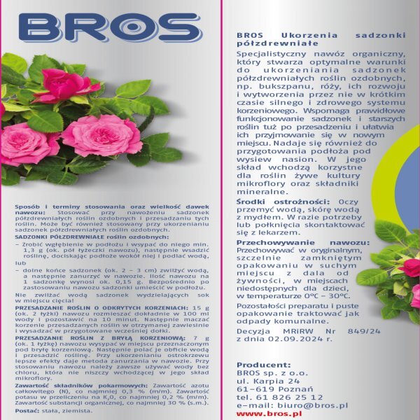 Specjalistyczny nawóz organiczny, który stwarza optymalne warunki do ukorzeniania sadzonek półzdrewniałych roślin ozdobnych, np. bukszpanu, róży, ich rozwoju i wytworzenia przez nie w krótkim czasie silnego i zdrowego systemu korzeniowego. Wspomaga prawidłowe funkcjonowanie sadzonek i starszych roślin tuż po przesadzeniu i ułatwia ich przyjmowanie się w nowym miejscu. Nadaje się również do przygotowania podłoża pod wysiew nasion. W jego skład wchodzą korzystne dla roślin żywe kultury mikroflory oraz składniki mineralne.